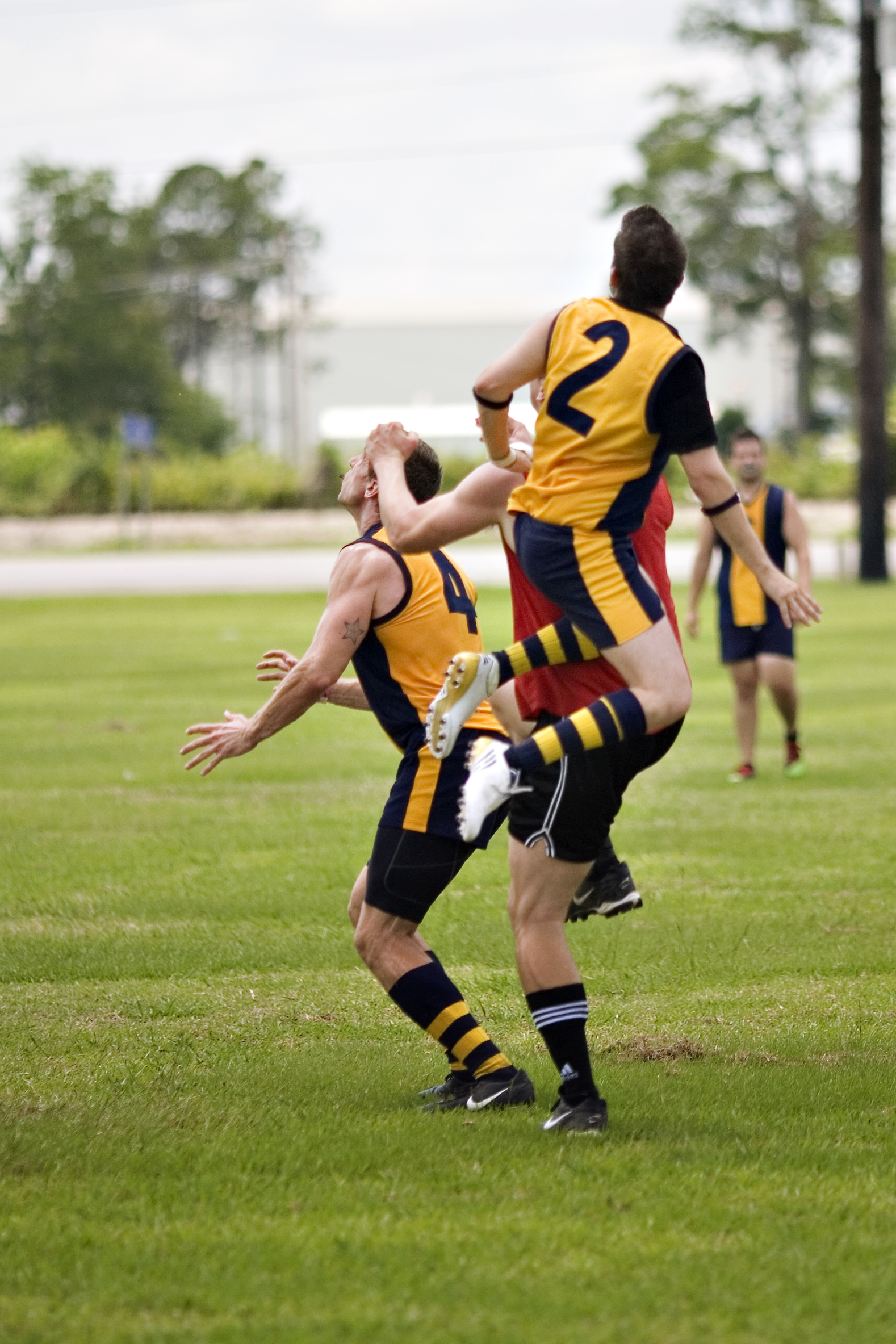 Not the best conditions for a full-length footy match, but this past Saturday in Baton Rouge, the Tigers and the Houston Lonestars duked it out in the second of their four-match series this season. Umpire Chris Liddy delayed the start of the match for a few minutes to wait for more players to appear. When none did, the Tigers dealt Houston promising recruit Kenny Delucca along with Jonathon Morrill and recent LSU grad Finky Finkelstein to even the sides.