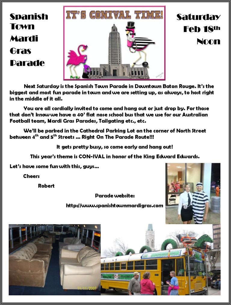 As in previous years we are setting the Team Bus up as a base camp for the 2012 Spanishtown Mardi Gras Parade. It’s the biggest and best Mardi Gras parade in Baton Rouge and we’ll be set up right on the parade route!!!!